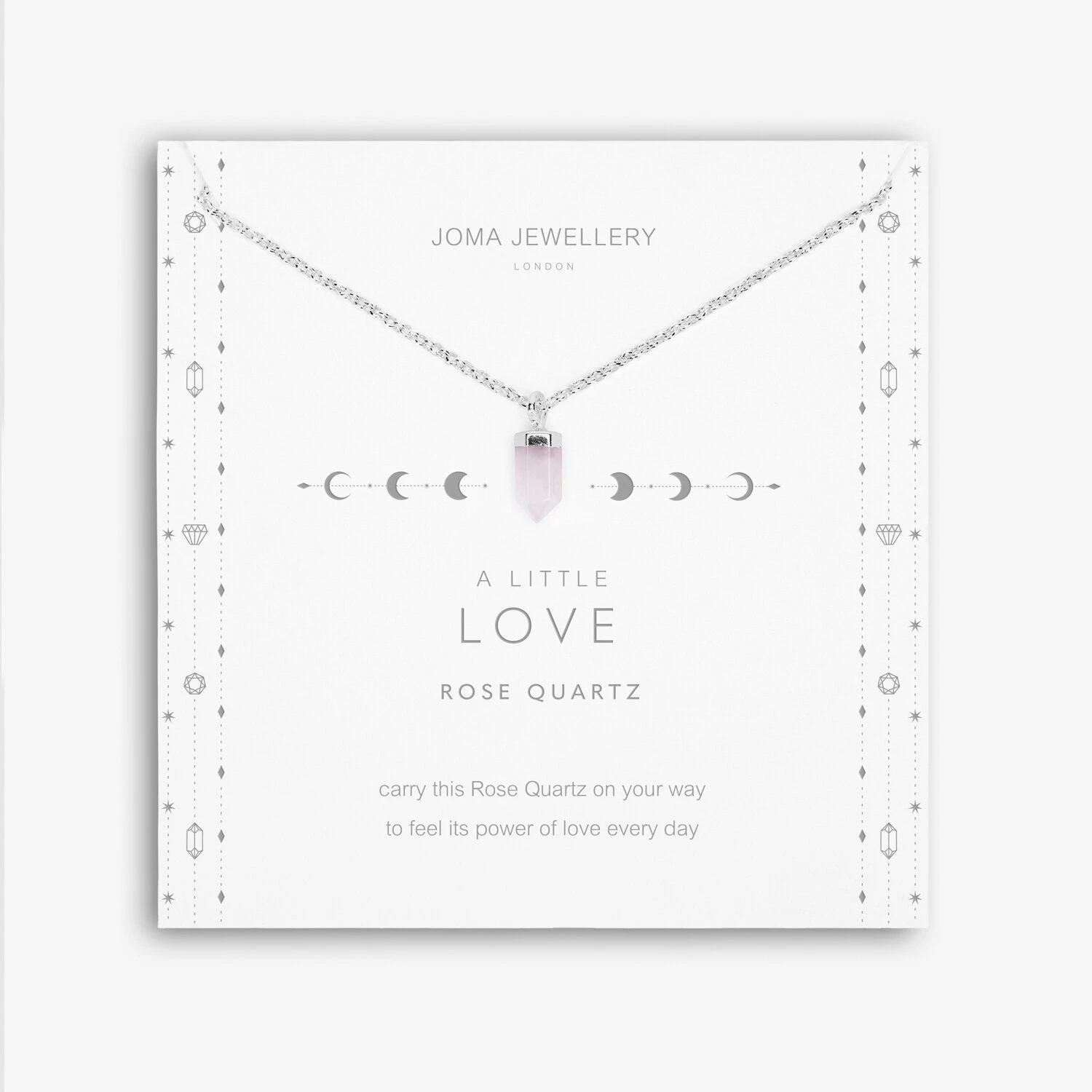 This Affirmation Crystal A little ‘Love’ Necklace features sparkling Rose Quartz pendant, known for its great healing properties. The ideal gift to help share a little love and positivity. The necklace is wrapped around an elegant card and stamped with a description of the stone’s powers and a sweet sentiment.