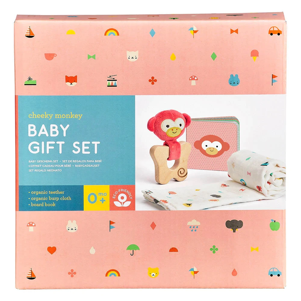 100% organic cotton muslin (machine washable). Organic cotton and FSC beech wood teether (detachable soft monkey teether machine washable). 10 page baby board book.